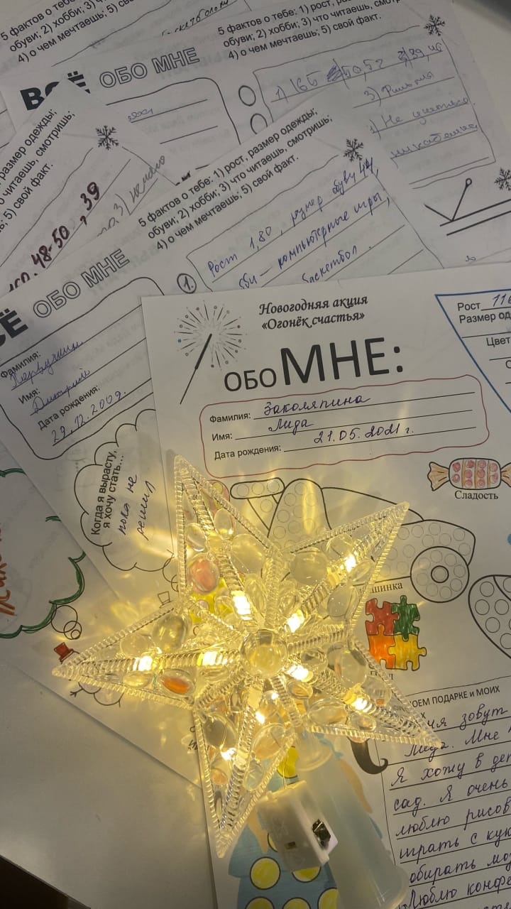 Наши воспитанники принимают участие в новогодней акции "Огонек счастья". Каждый из ребят написал о себе и своих увлечениях и интересах и нарисовал то, о чем мечтает. Письма с желаниями детей будут направлены дарителям.